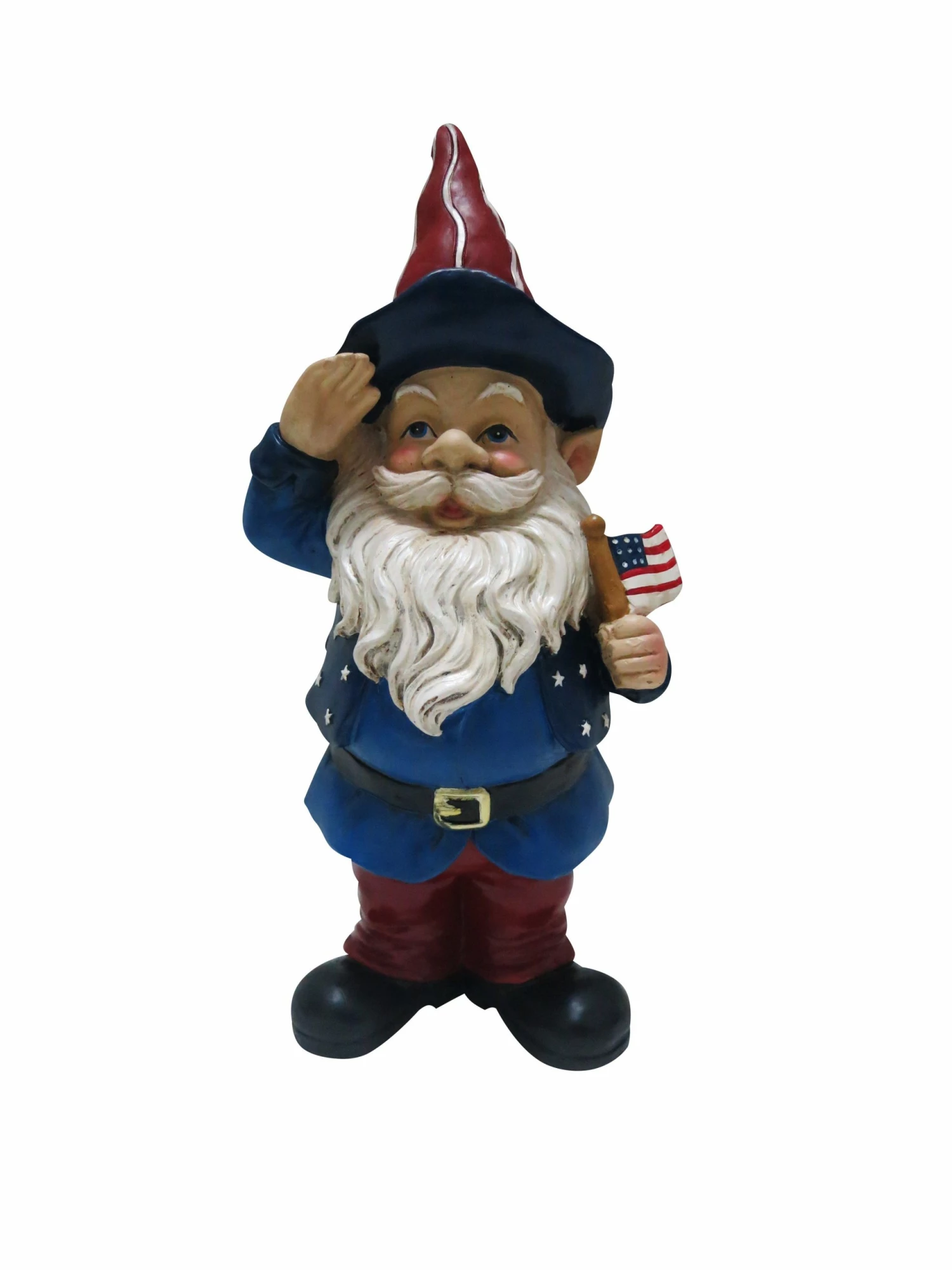 Showcase your patriotic spirit with this Americana gnome. This charming guy welcomes visitors with a friendly salute. The painted polyresin brings this piece to life.