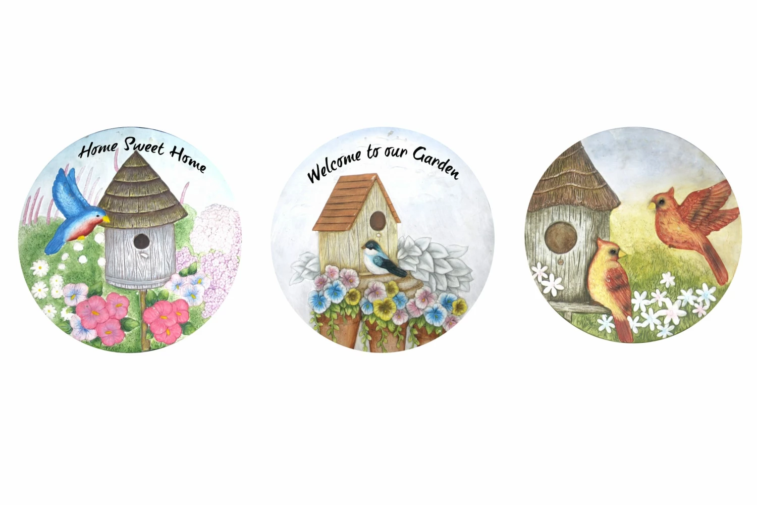 These stepping stones contain welcome messages for those that walk your garden paths. Decorated with birds and their houses.