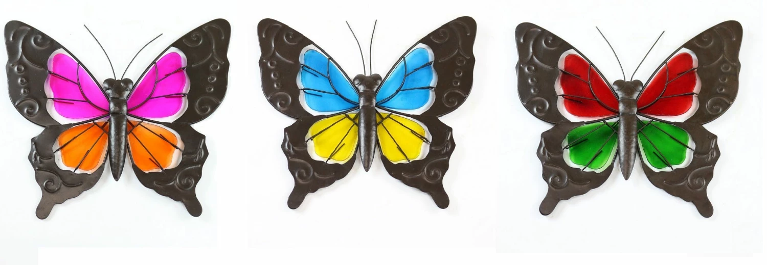 These wall hanging, metal butterfly decorative pieces look wonderful in any setting. Each wing is accented by translucent plastic which is a contrast from the metal body.