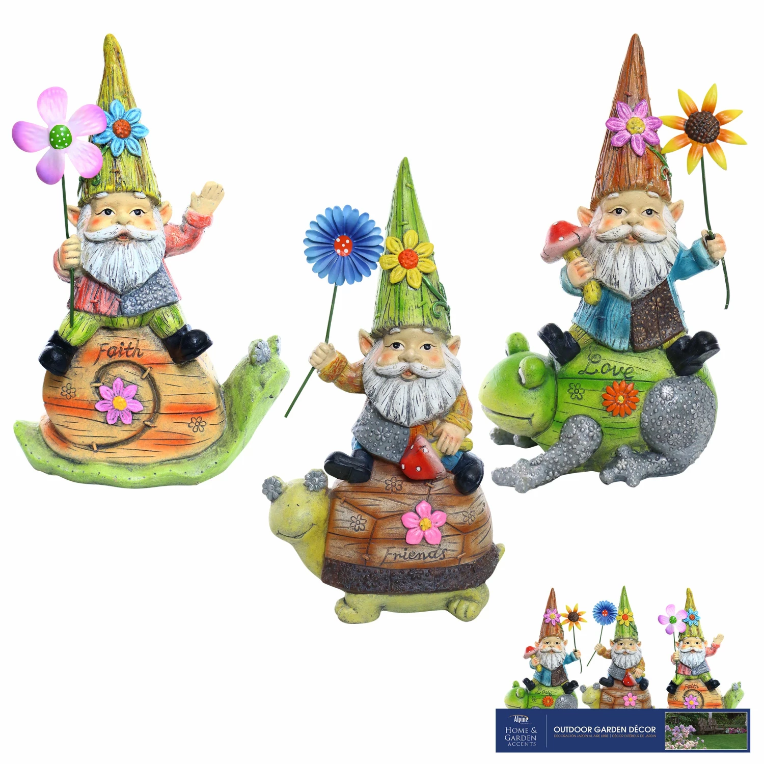 These charming little gnomes are ready to welcome the spring with their floral hats, long stemmed flowers and riding their faithful animals. Constructed out of polyresin, but finished to look carved out of wood.