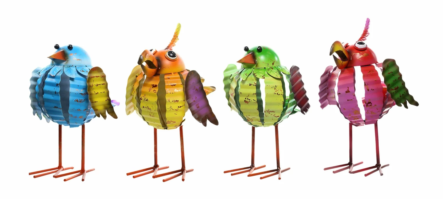 Add style and color to any garden or yard with these unique and colorful metal birds with ribbed texture and rustic details.