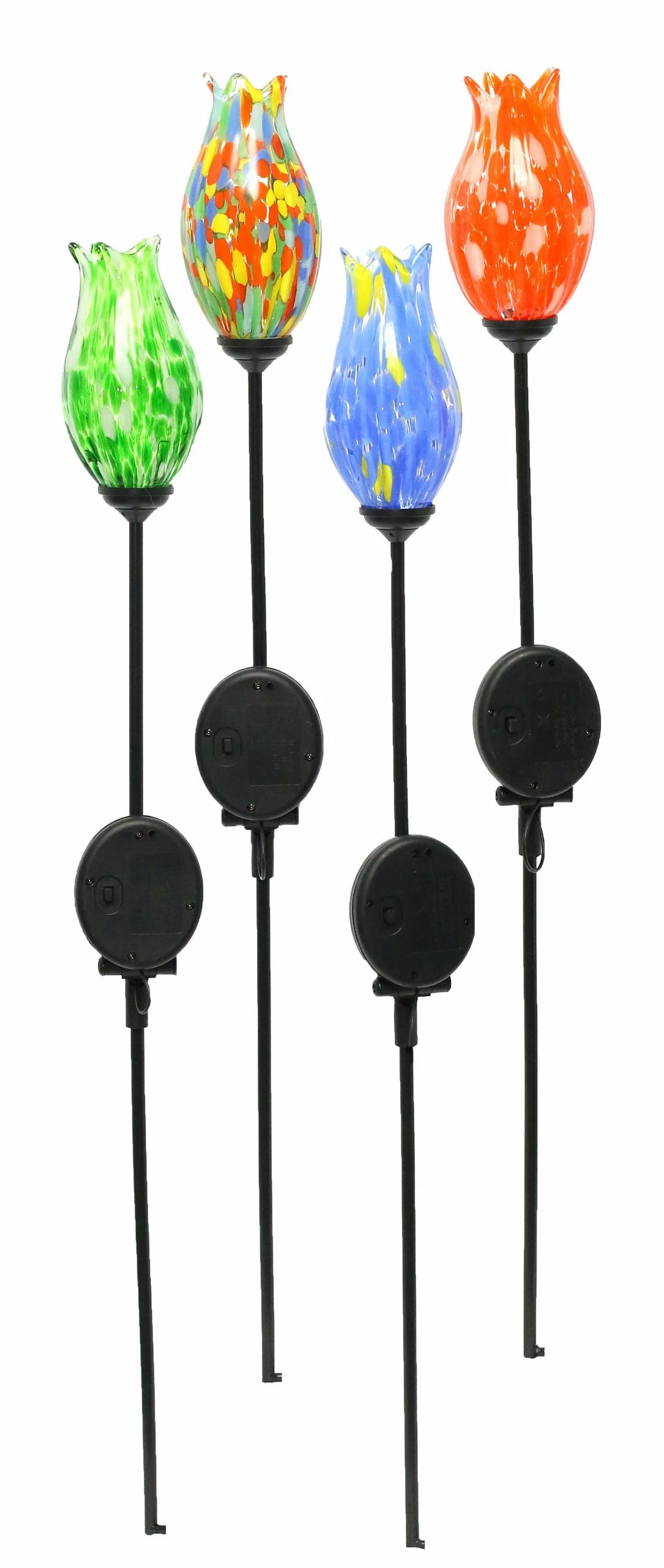 These colorful blown glass flower stakes are an elegant accent piece to any lawn. At night the LED lights automatically activate and stay on for up to 8 hours after a full day’s charge from the solar panels.
