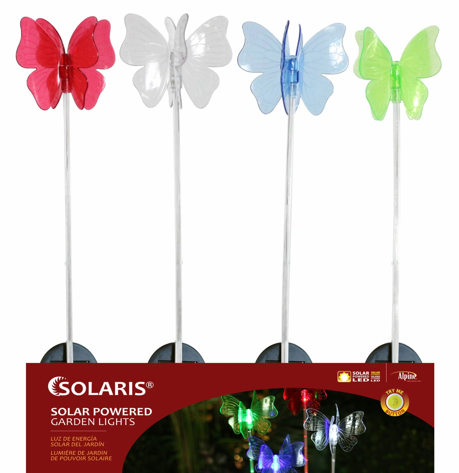 The toppers on this solar powered butterfly stake rotate creating a lively display. The whole stake lights up due to its fiber optic shaft.