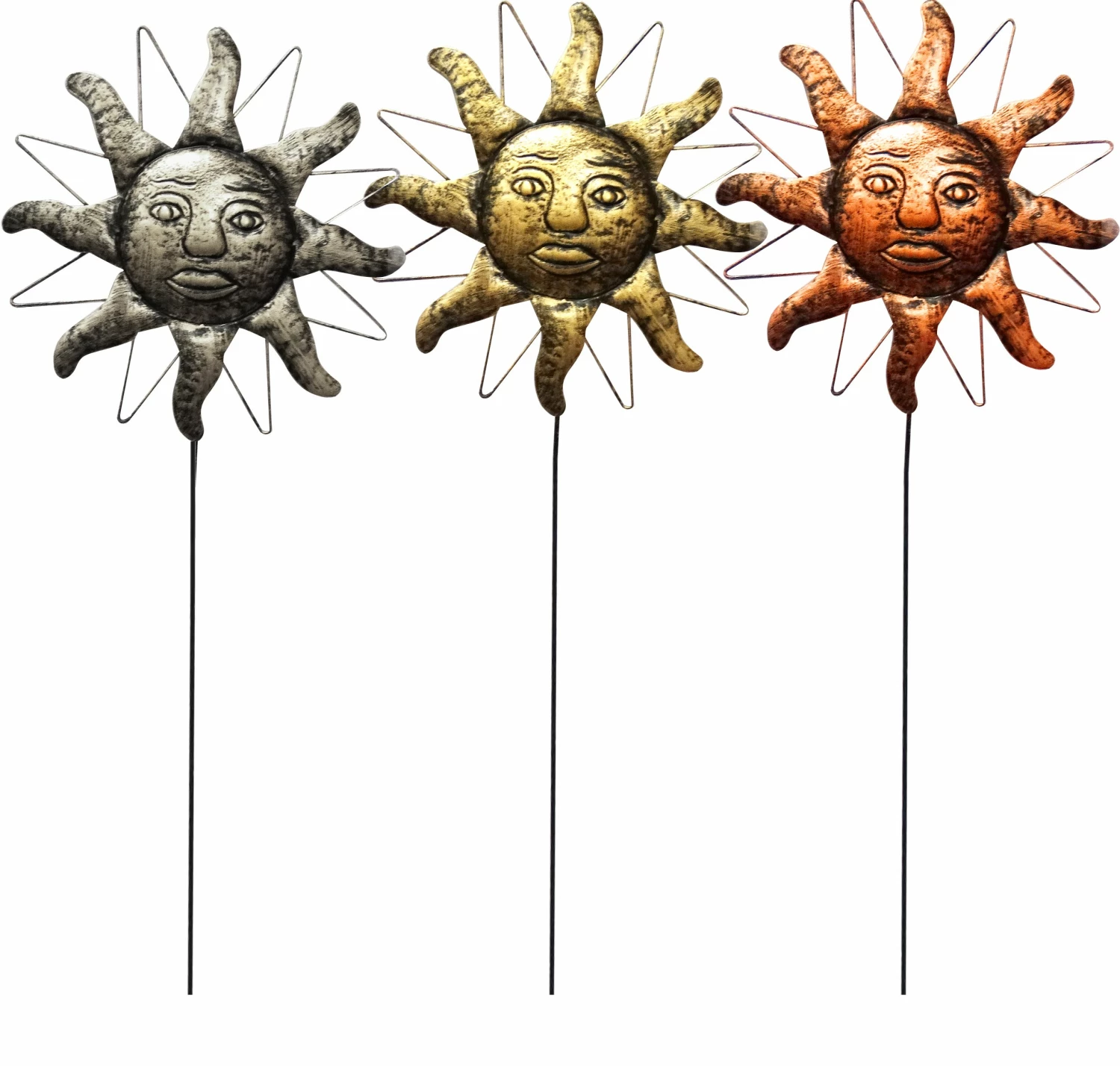 These metal sun stakes look great in a lawn or garden. The smiling face of each stake shimmers in the light in bronze, silver and gold varieties