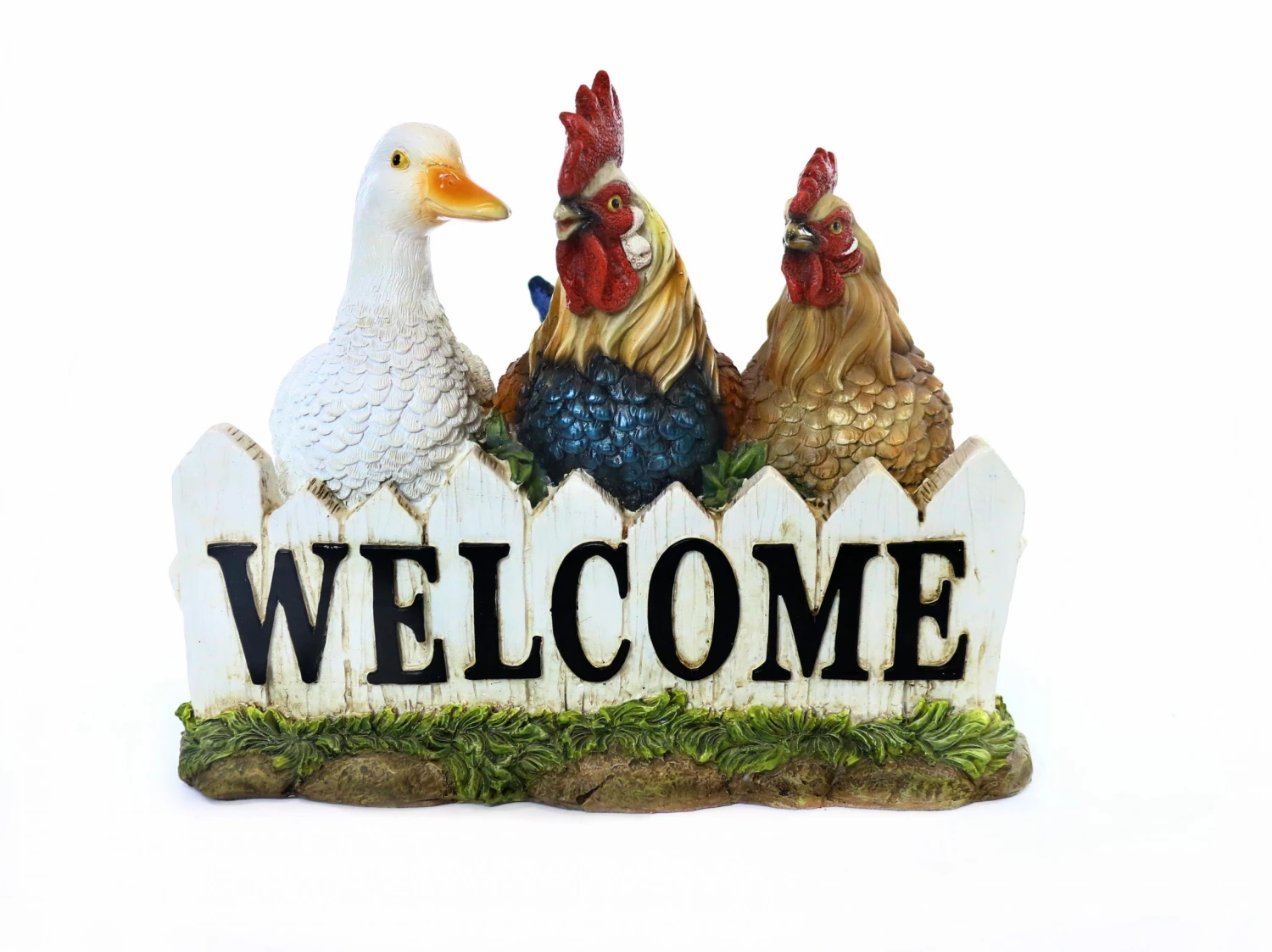This self standing welcome sign features a charming crew of chickens and a duck behind a fence. Beautifully painted and constructed out of polyresin.