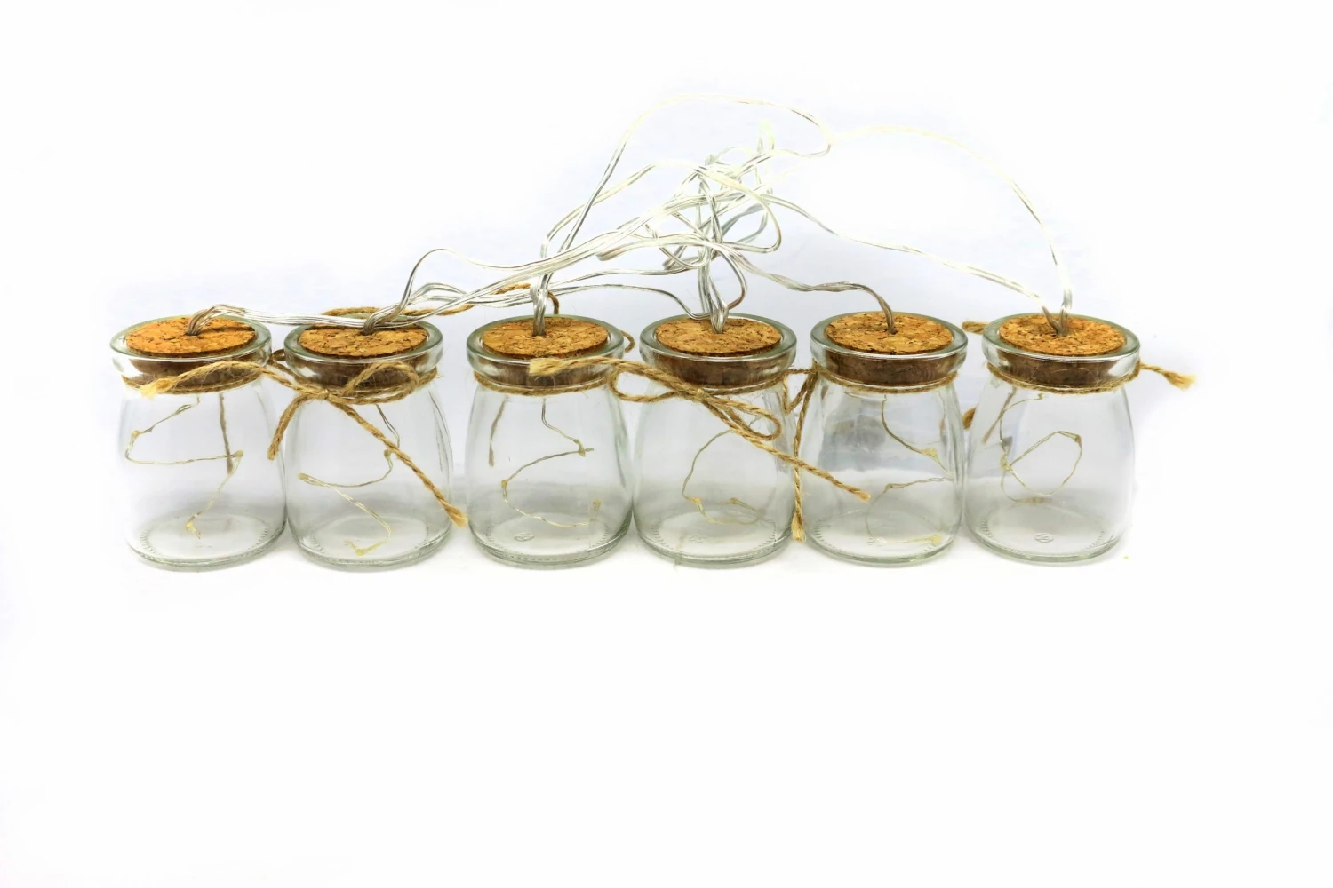 Fill the night with the warm glow of these jar string lights. Set the right mood in any room or brighten up your outdoor space. Made of beautifully blown glass with a hemp string tied around each jar. Available in warm white and multi-colored LED versions. Includes 6 hour battery timer for hassle free operation.