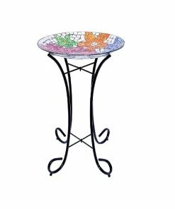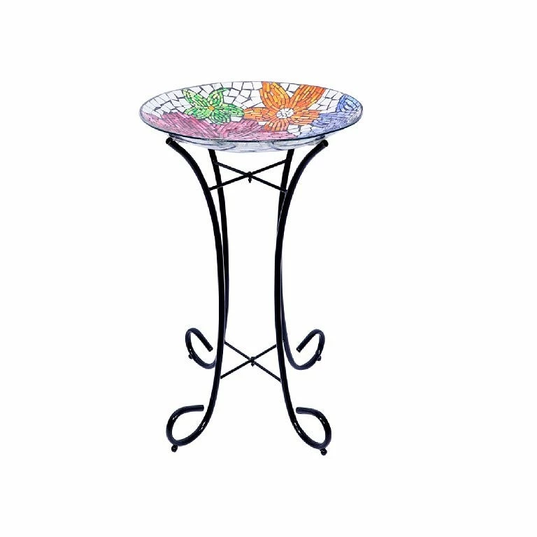 Gorgeous 18″ diameter metallic glass mosaic bird bath is uniquely designed in the shape of colorful flowers Includes a metal stand.