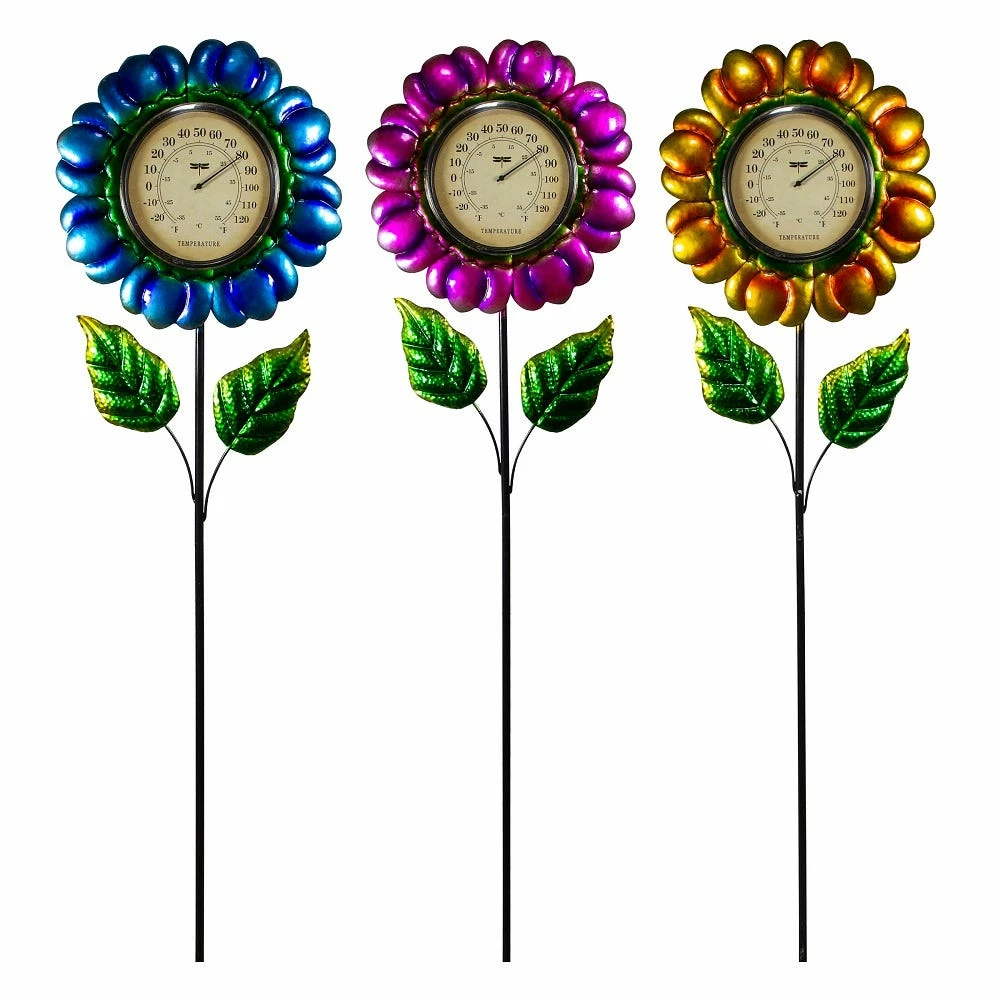 - GREAT DECORATIVE GLOSSY FLOWER GARDEN STAKE: Masterfully crafted assorted glossy metallic flower garden stakes with thermometer make a great addition to any type of outdoor décor