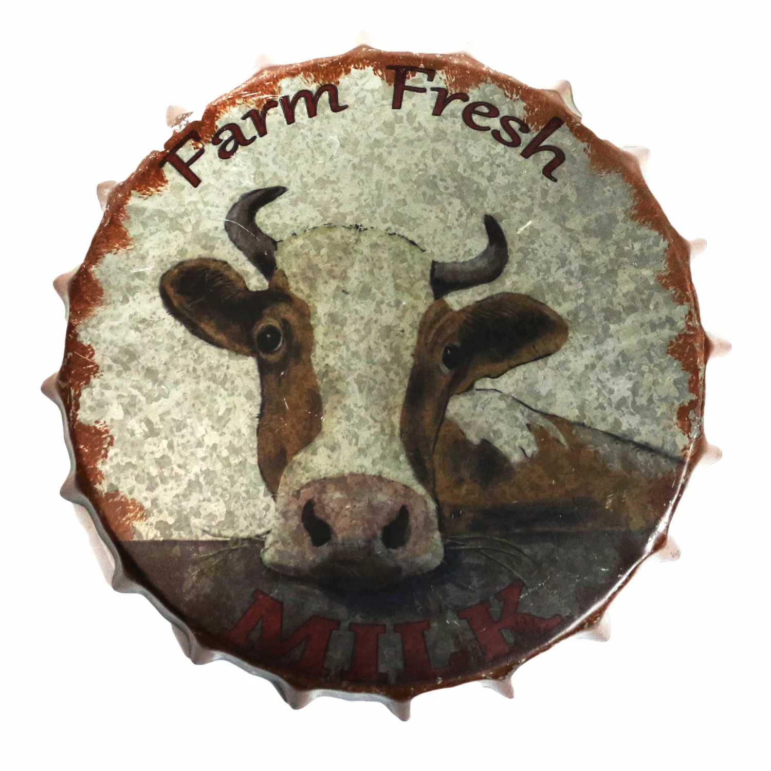 Add a bit of farmland flair with this bottle cap sign which hangs from a rope. Cow design on the front.