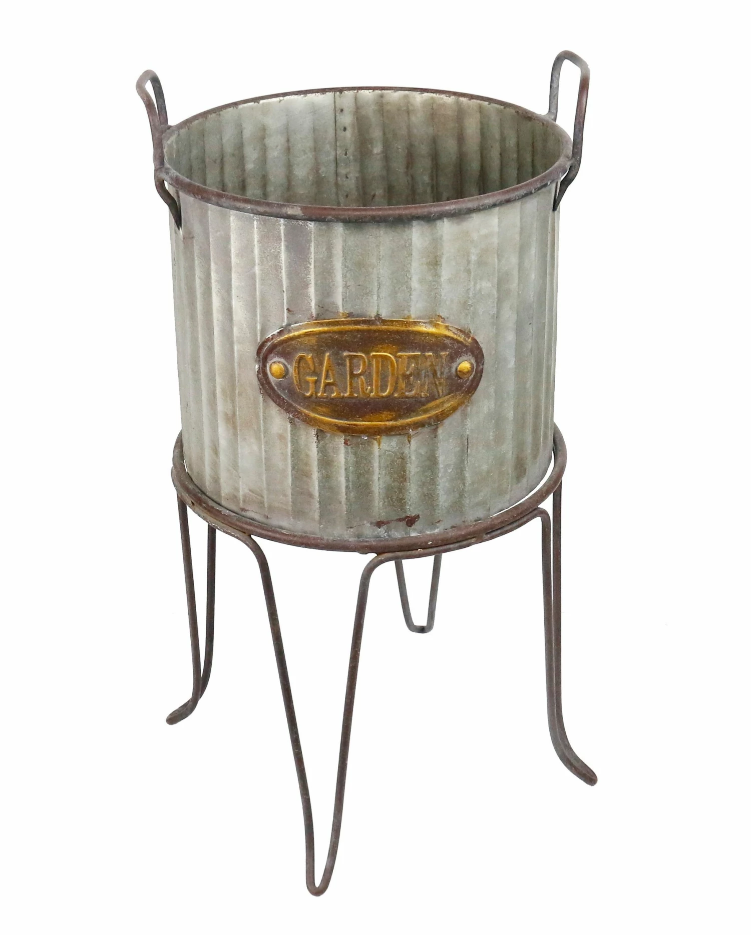 This rustic washbucket is meant to be filled with your favorite plants. Sheet metal texturing add to the rural feel of the planter.
