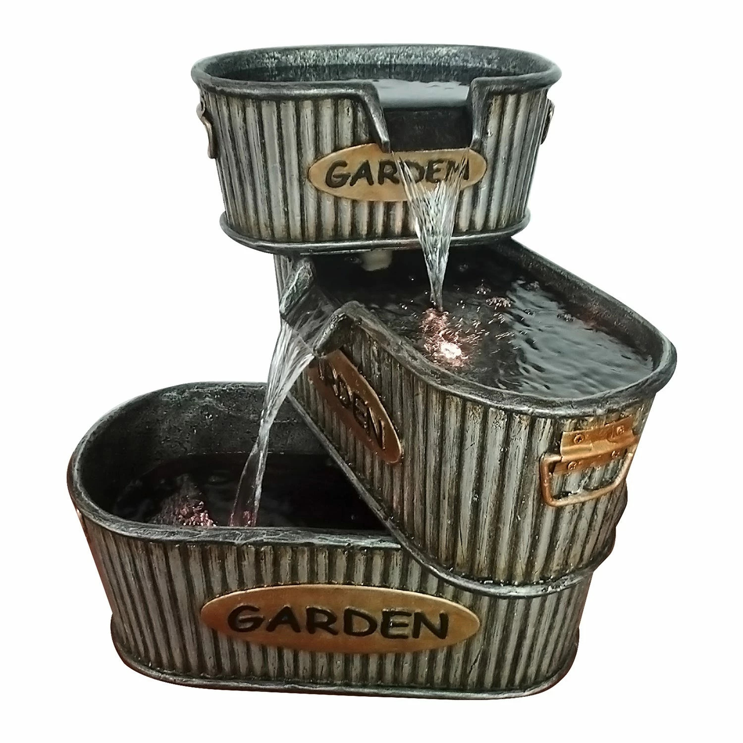 With a rustic appeal and multiple water tiers, this fountains creates a relaxing and homey atmosphere. Skillfully crafted to be balanced and durable; can be enjoyed inside or out. . Pump and all necessary parts included for a quick and easy installation.