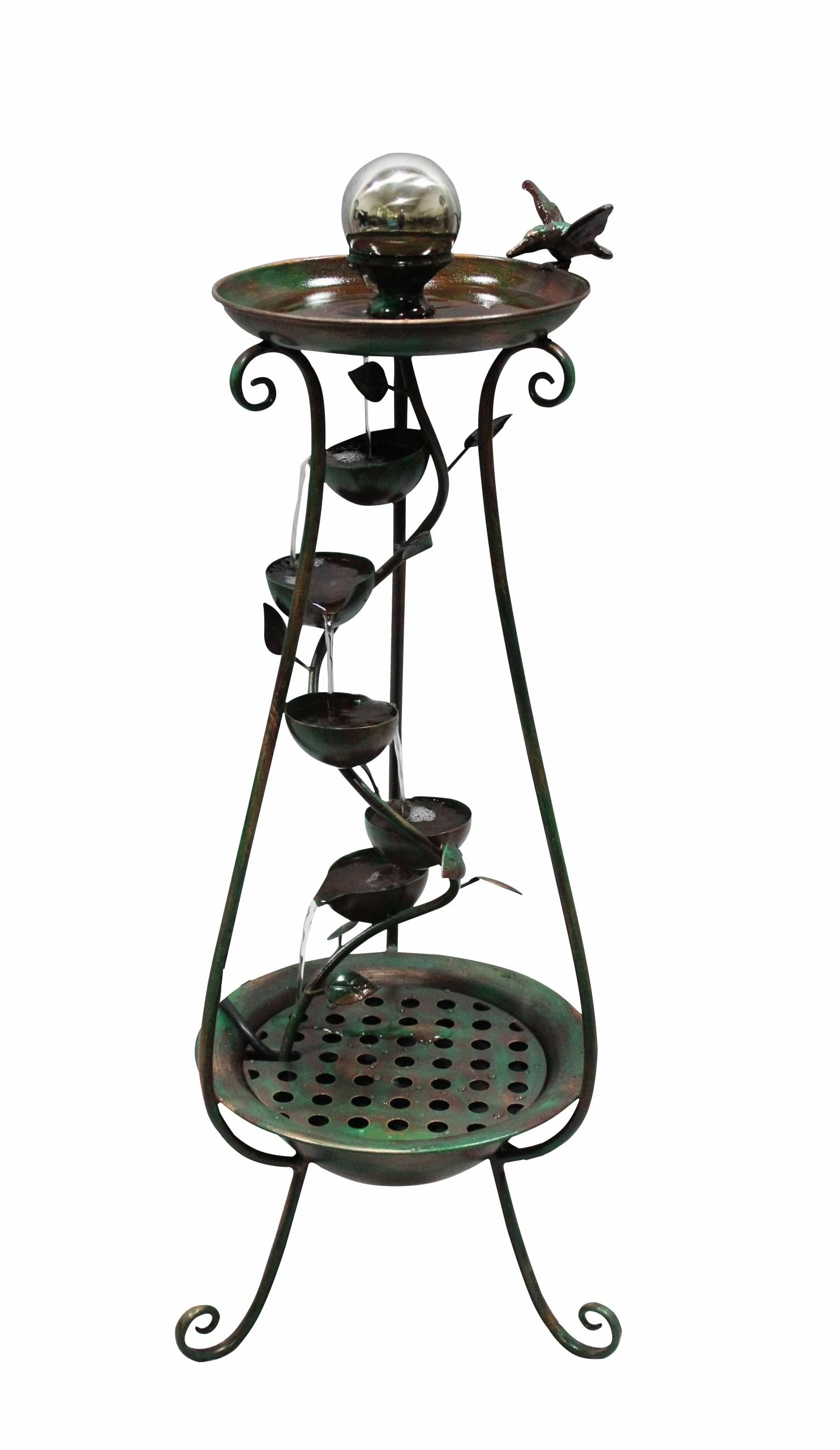 Made from 100% metal, this fountain has a very rustic appeal to it. Multiple water flows create a relaxing and meditative atmosphere. Can be placed inside or out.