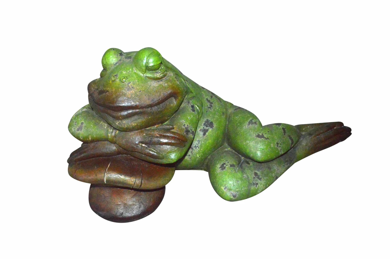 Accent your spring decor with this unique sleeping frog statue. This frog is hand painted in brown and green tones and sits 14in tall.