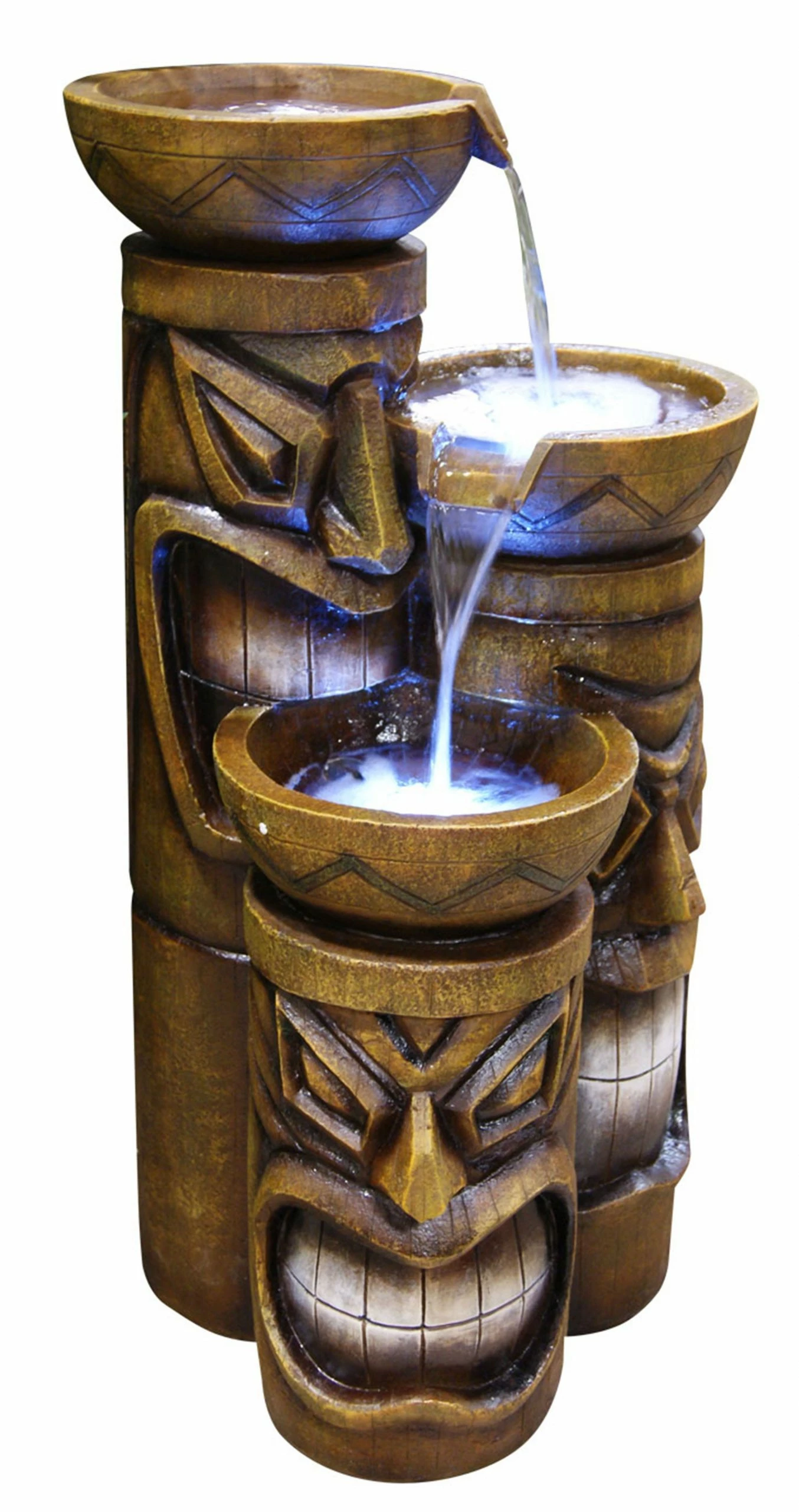 These three tikis come together to form a fun water feature with a tropical twist. Bold expressions and high quality design make this indoor or outdoor fountain a great choice. Three large bowls sit atop the head of each tiki statue each pouring water to the next. Bright LED lights in each bowl highlights the whole show.