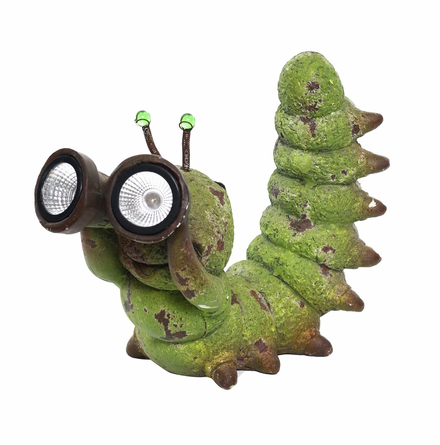 Accent your spring decor with this unique Solar Caterpillar statue with Binoculars. Hand painted in brown and green tones, this caterpillar’s binoculars include 2 LED lights that are solar powered (no power cord is needed).