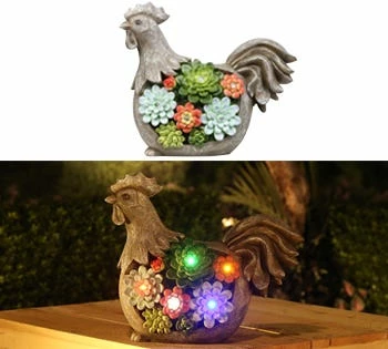 Decorate your lawns and gardens with unique decor and beautiful attractions. This statue features a stone colored rooster with succulent designs on its body. Each succulent houses a solar-powered LED light which lasts up to 8 hours on one full charge. Watch as it illuminates your evenings with its soothing ambient glow. Elevate your nighttime display with finely crafted pieces of art that light up your evening atmosphere.
