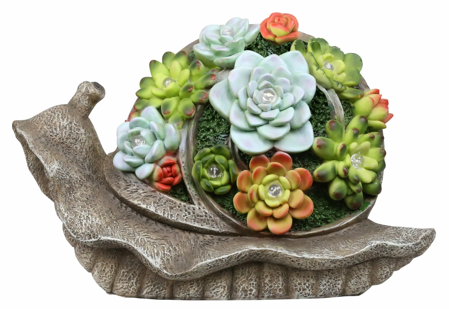 Decorate your lawns and gardens with unique decor and beautiful attractions. This statue features a stone colored snail with succulent designs on its shell. Each succulent houses a solar-powered LED light which lasts up to 8 hours on one full charge. Watch as it illuminates your evenings with its soothing ambient glow. Elevate your nighttime display with finely crafted pieces of art that light up your evening atmosphere.