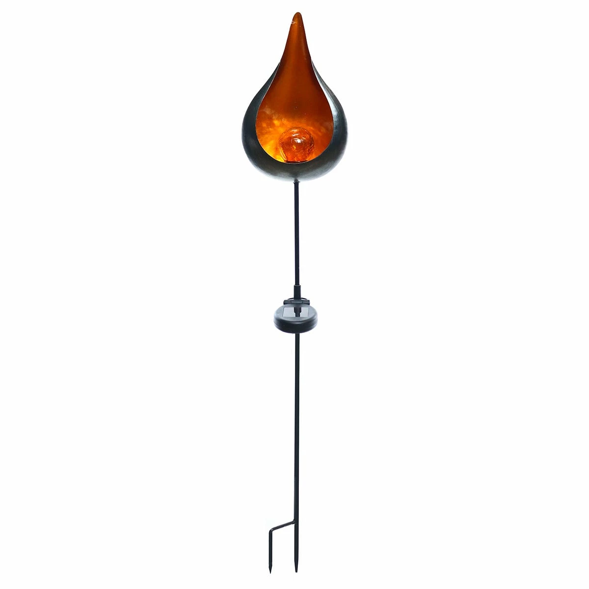 This solar garden stake lamp has an abstract style. Shaped like a hollowed out teardrop and lined with orange, it gives an appearance of an open flame. The crackled bulb design gives the light a textured appearance. Solar panels provide up to 8 hours of power on a full charge.