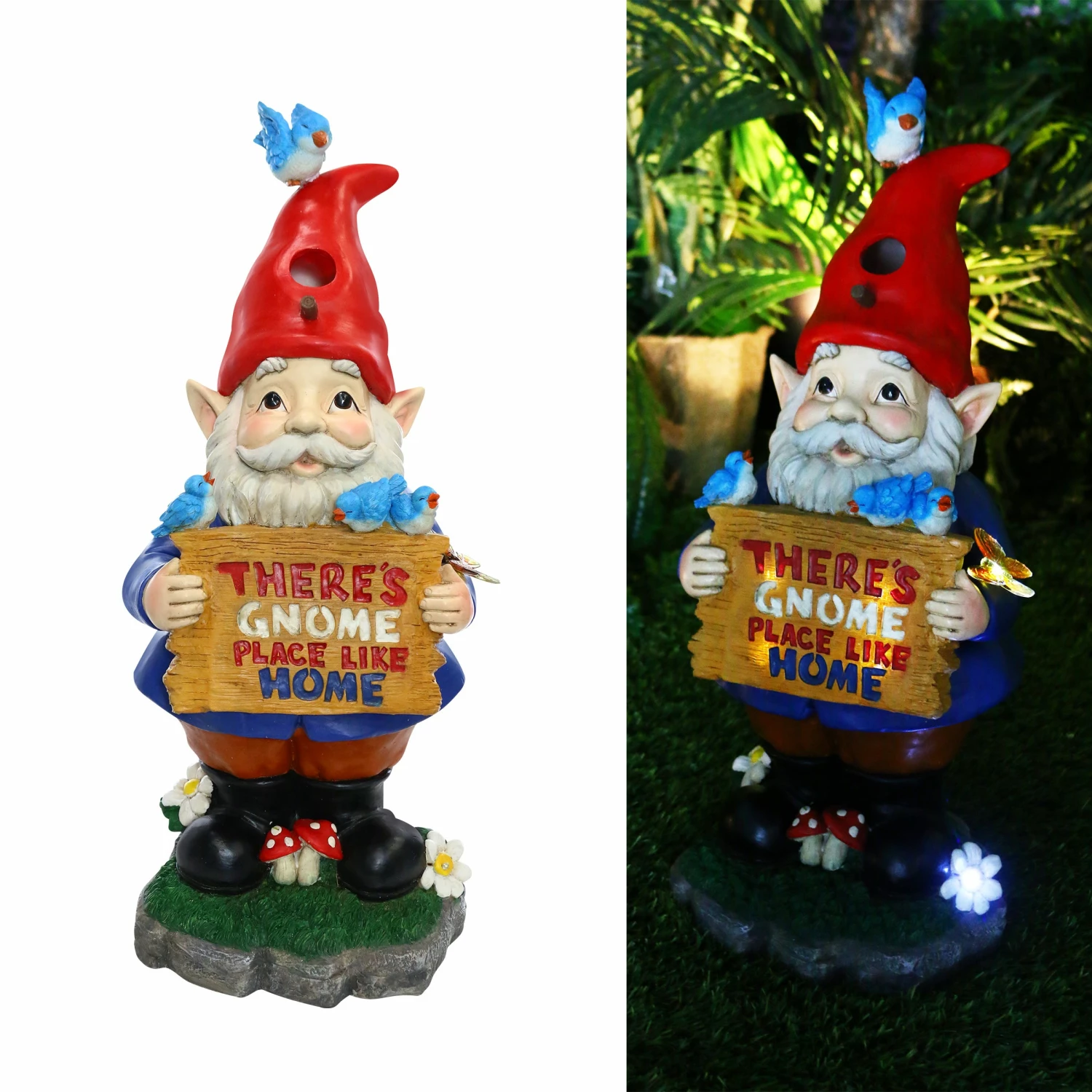 This gnome is friend to all manner of creatures, especially birds. He even has a birdhouse built into his hat! Holds a sign saying ‘There’s Gnome Place Like Home’. Includes LED lights powered by solar panels which activate at night.