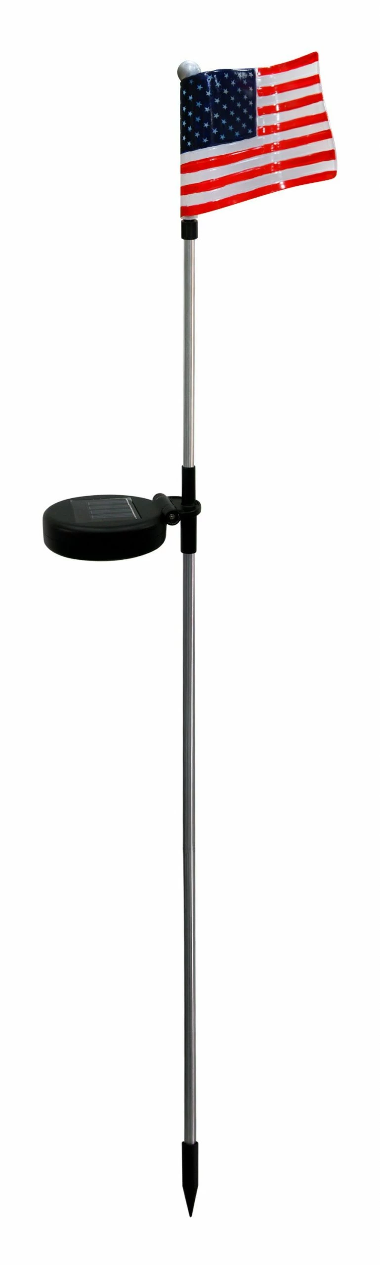 This solar powered U.S. Flag LED Stake Light is a fantastic way to show your American spirit all year long or add a decorative touch to your backyard or garden scape. The wavy, translucent plastic flag illuminates its red, white, and blue colors by a bright white LED housed in the stainless steel stake. The solar panel provides up to 8 hours of power on a full charge.